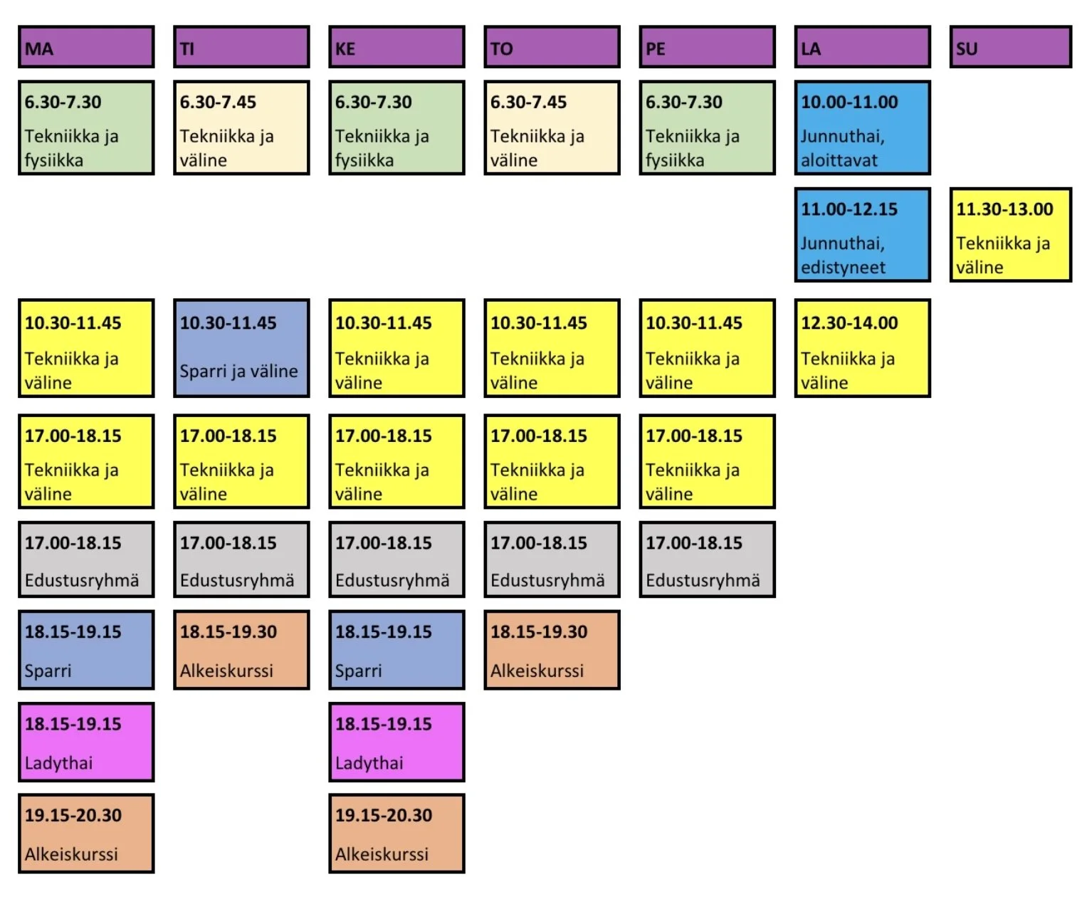 HUOM: la ja su tekniikkatreeneissä voi ohjelmassa olla myös kevyttä ja teknistä sparria. Jos sparraaminen kiinnostaa, mutta et ole vielä rohjennut sparritreeniin, viikonlopputreenit ovat sinua varten.